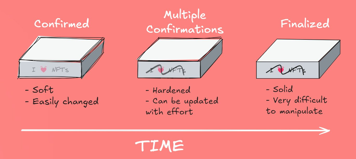 Finality: The point at which a transaction is deemed irreversibly added to a given chain's ledger. This term isn't uniformly used across chains when it comes to technical properties though, so be it's best to not assume like-for-like in all contexts. In the Ethereum ecosystem, this is used when the below conditions are met: