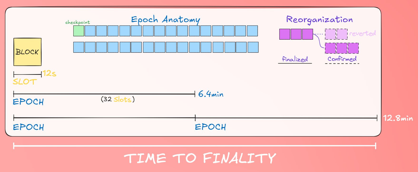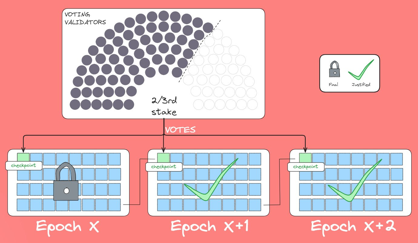 Validator Voting - Each epoch (32-block window) validators will vote on the checkpoint block of the current and previous epoch until specific checkpoint blocks reach 2/3rd majority of staked